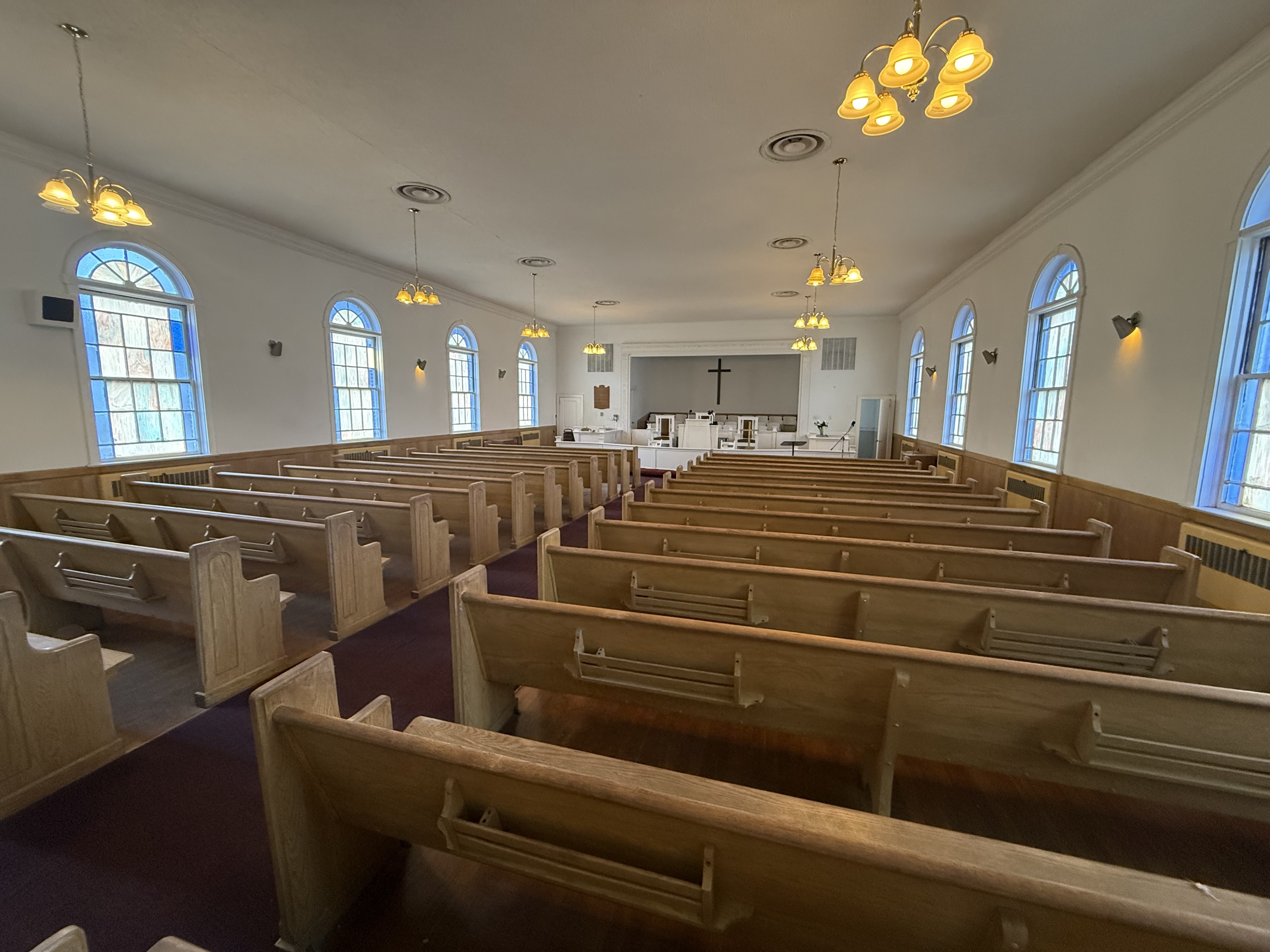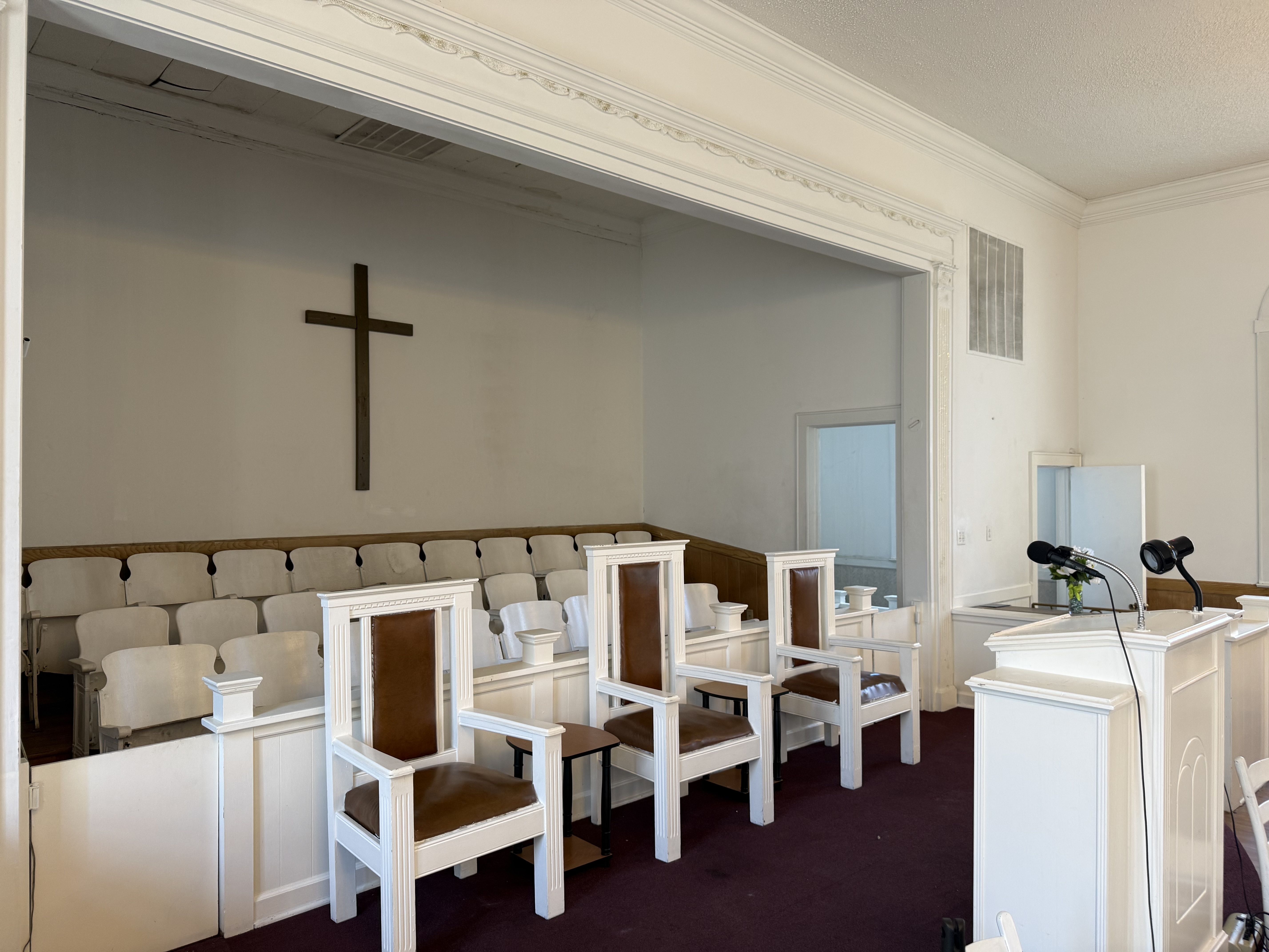 - Traditional sanctuary with pew seating, pulpit, and choir area