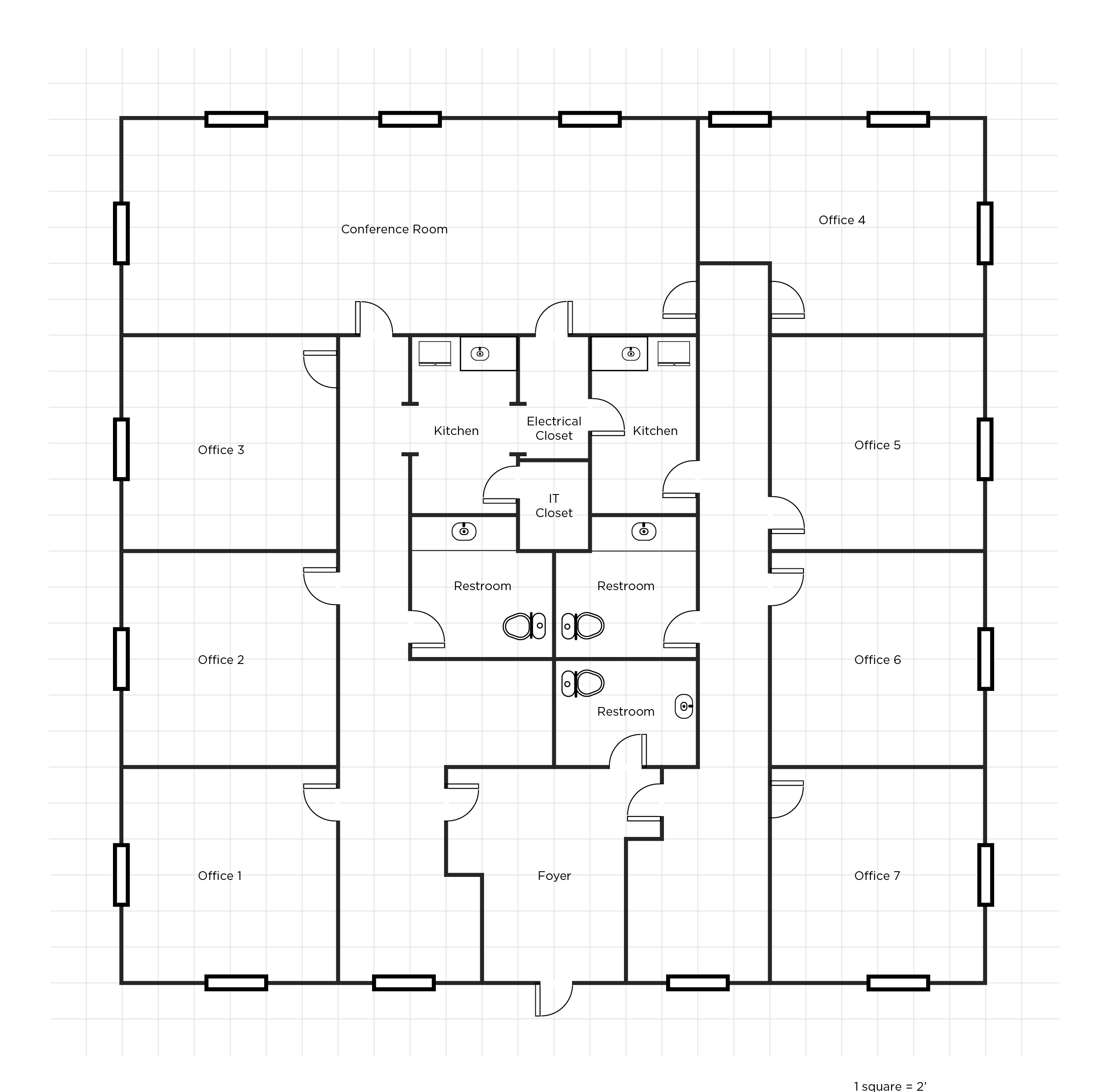 - Efficient layout with 6 to 7 windowed offices, expansive conference room, and 3 restrooms within the space